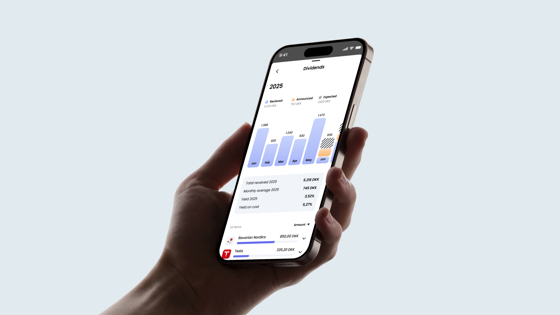 Når du åbner udbyttesiden, bliver du mødt af et årsbaseret overblik over dine udbytter. Det giver dig en enkel, men dybdegående forståelse af, hvordan dine udbyttebetalinger fordeler sig over tid – og hvad du kan forvente fremadrettet.
